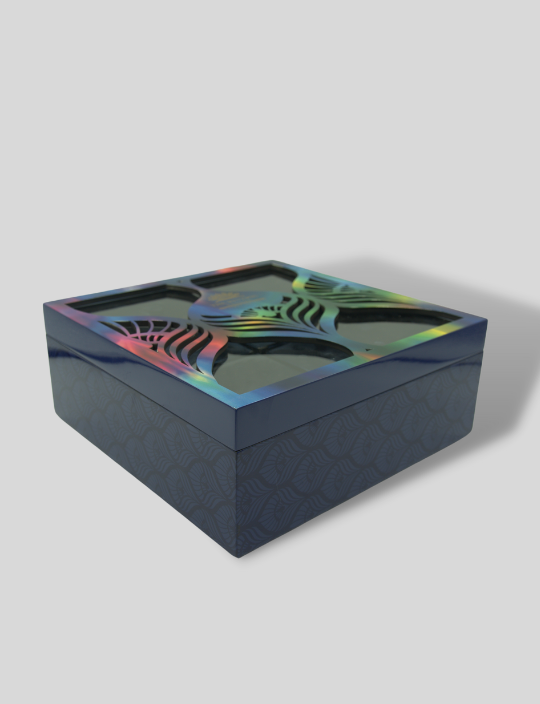 - Hộp bánh chất liệu sơn mài, kết hợp với hoạ tiết nắp được CNC và in một cách chi tiết, tỉ mỉ.